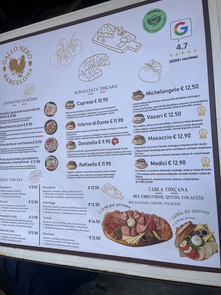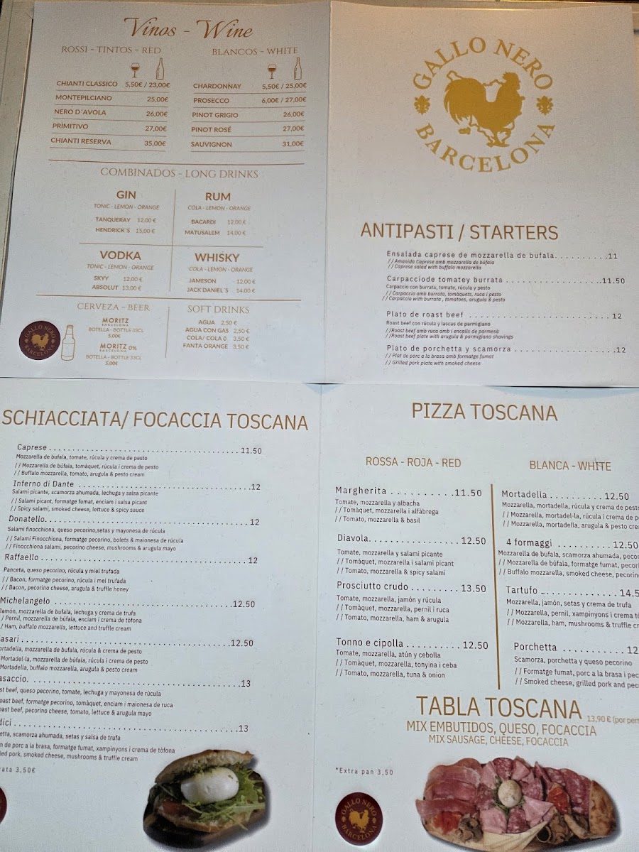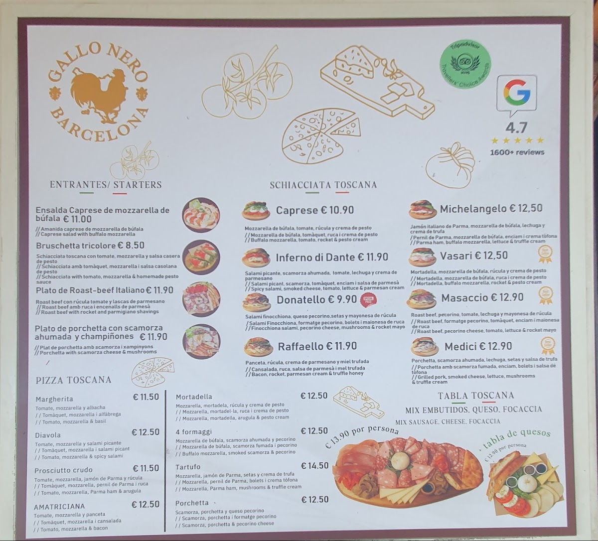 Welcome to Gallo Nero, an enchanting little Italian restaurant nestled in the heart of Barcelona, at Carrer de Jaume I. Gallo Nero offers a delightful selection of authentic dishes that showcase the rich flavors of Tuscany. From their PIZZA TOSCANA featuring the Margherita de Bufala, topped with creamy bufala mozzarella and fresh basil, to scrumptious schiacciata options like Ruccellai with gorgonzola and mushrooms, each dish is crafted with passion.